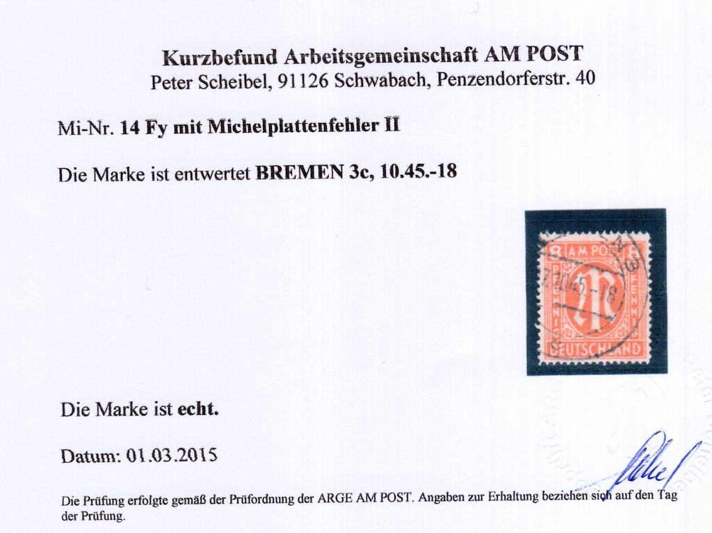 Michel 14 Fy with plate error II without any faults. Certificate by the study group.
