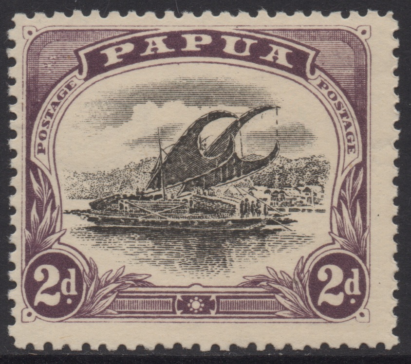 YOU ARE BIDDING ON: PAPUA 1910 2d BLACK-PURPLE LAKATOI STAMP MH WMK SIDEWAYS PER.12.1/2 (VARIETY) SMALL COLOURED FLAWS IN LEFT SPANDREL AND LARGE 1st  (P) FROM PAPUA.