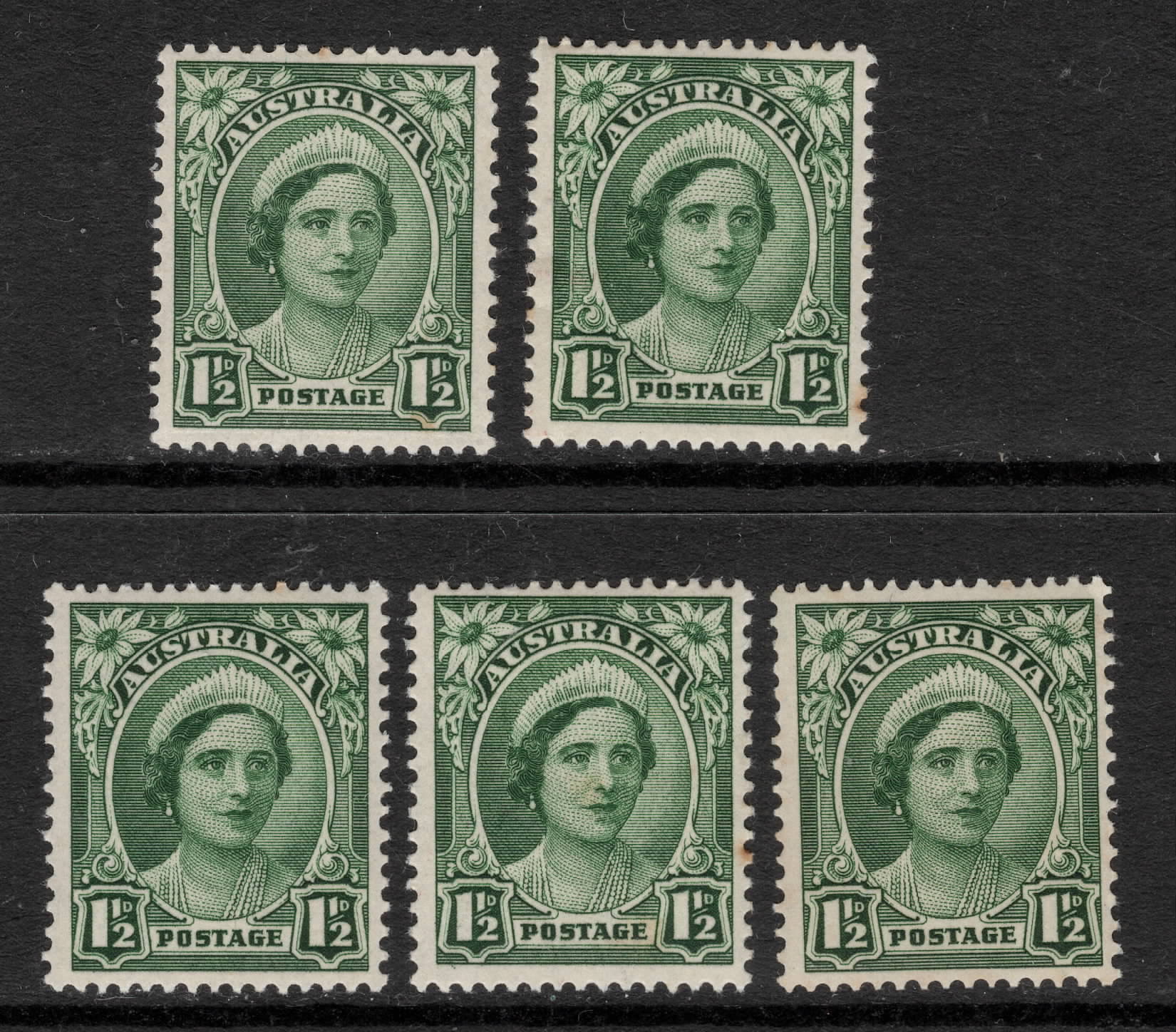 YOU ARE BIDDING ON: AUSTRALIA 1949 1.1/2d GREEN QUEEN ELIZABETH STAMPS X (5) NO WMK PERF.15 X 14 MNH.
